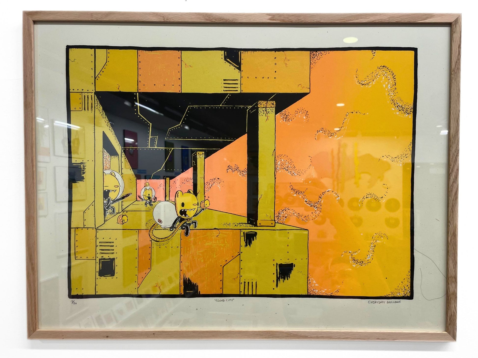 A Limited Edition everyday balloons screen print, with a wood frame, cardboard backing, and an acrylic front window.