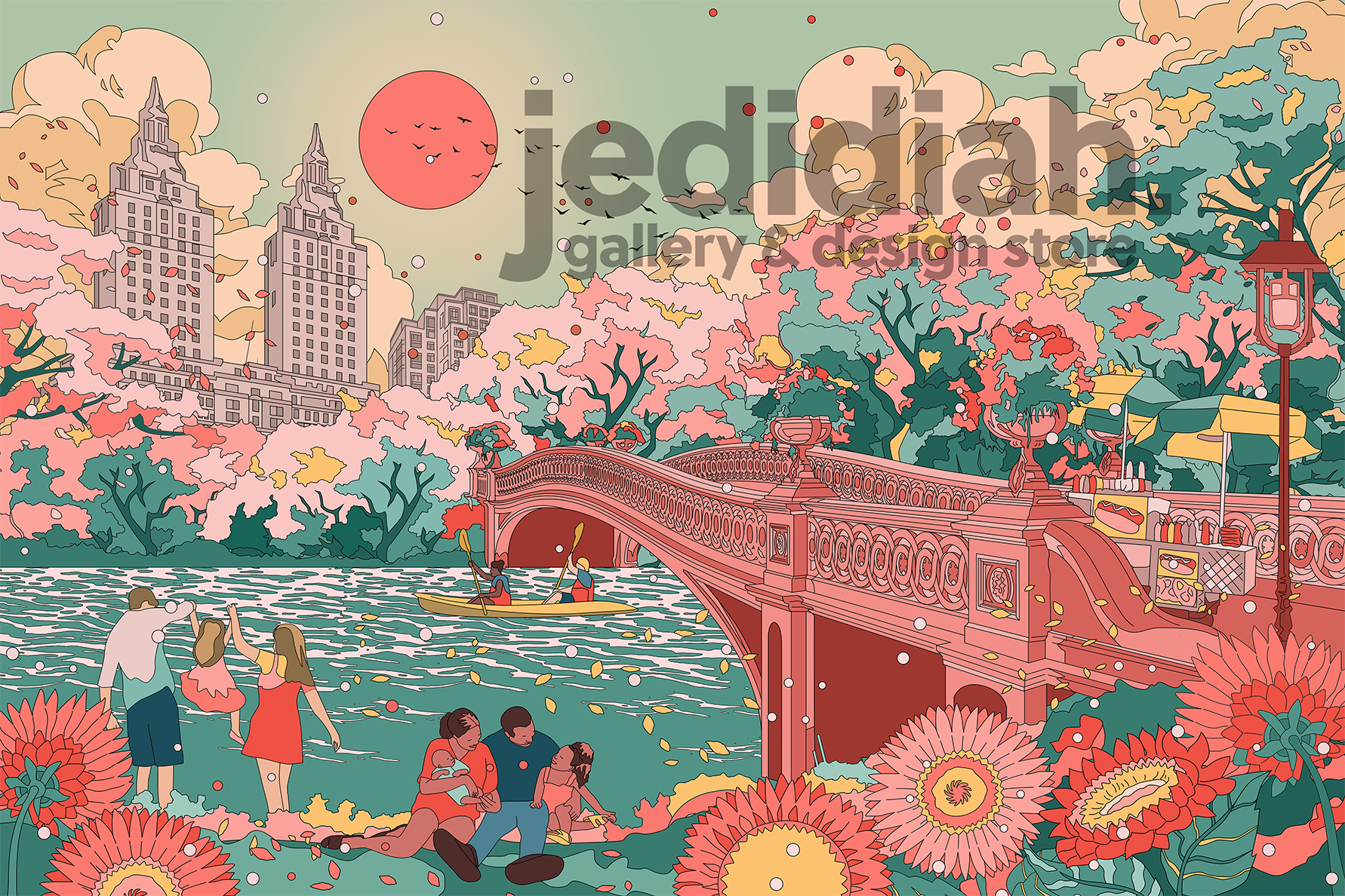 Capture the essence of spring in New York City with this stunning print by Mega Asellia. This beautiful drawing showcases Bow Bridge in Central Park during the season of renewal, with figures relaxed and enjoying the vibrant atmosphere beneath blooming trees. Perfect for bringing warmth and urban charm into any space, this open edition print celebrates the peaceful moments found in the heart of the city.